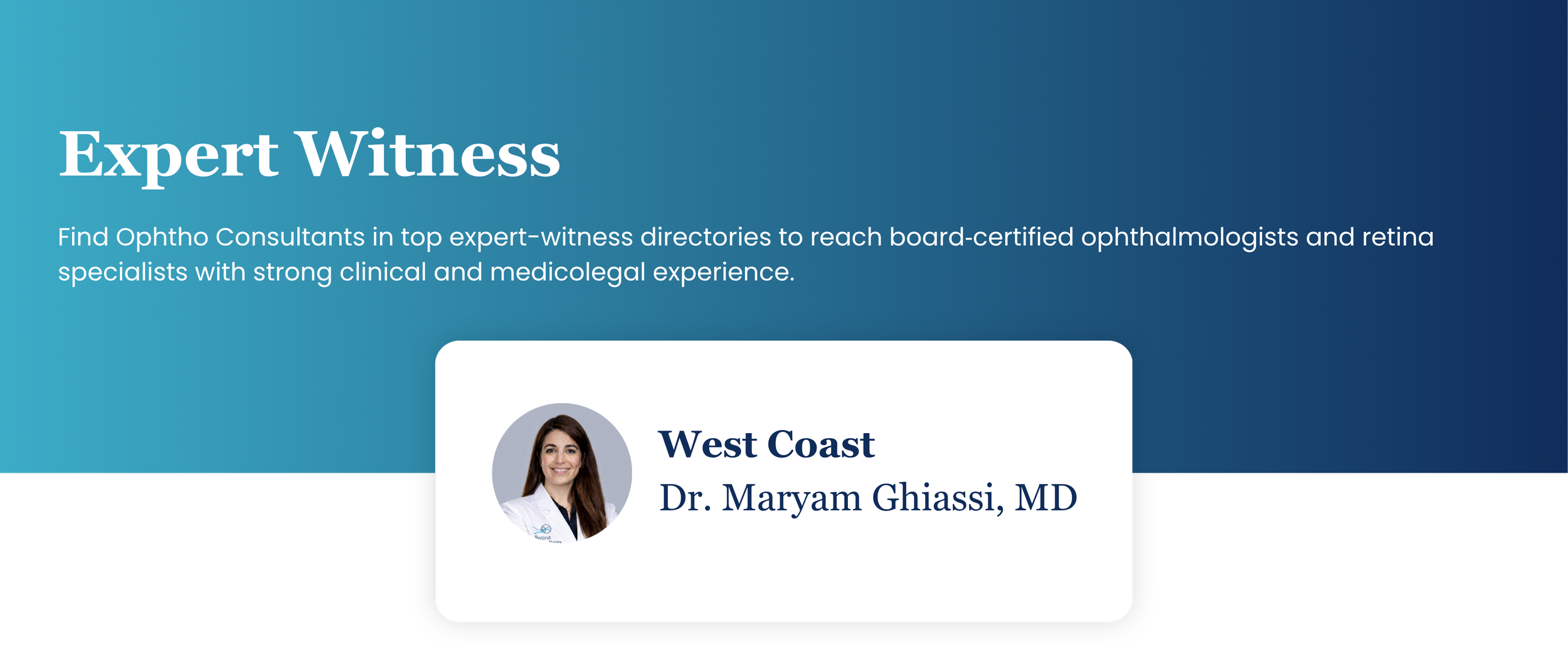 Dr. Maryam Ghiassi, MD maintain active practices and provides objective, evidence‑based opinions on surgical outcomes, retinal disease, eye trauma, delayed diagnosis, malpractice, and causation. Reports are concise, well‑referenced, and focused on key legal issues.